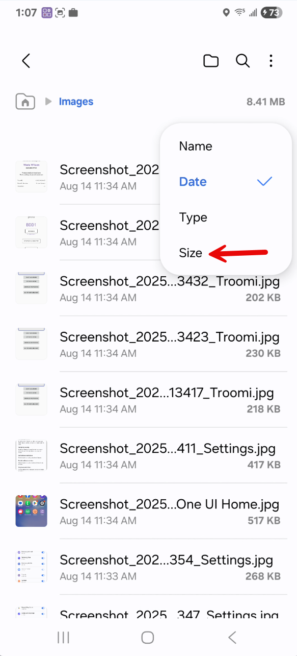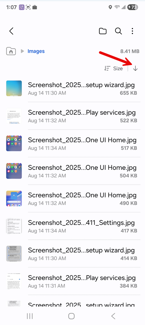 - Ensure the arrow is pointing down. This means the items are sorted largest to smallest in size. From there, you can delete your largest files to clear up space on the device.